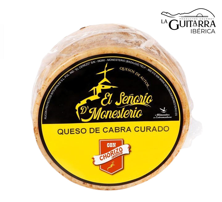 Queso de Cabra con CHORIZO IBÉRICO con más de 45 días de curación.. Este queso contiene en su interior uno de los productos estrella de la región de Extremadura, el Chorizo ibérico de Monesterio. La conjugación de este queso de cabra con el chorizo ibérico, hace que aporte al paladar un sabor exquisito inolvidable.